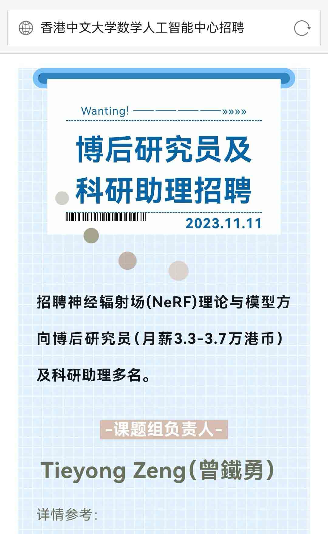 2023.11.11 招聘神經輻射場(NeRF)理論與模型方向博后研究員(月薪3.3-3.7萬港幣)及科研助理多名。