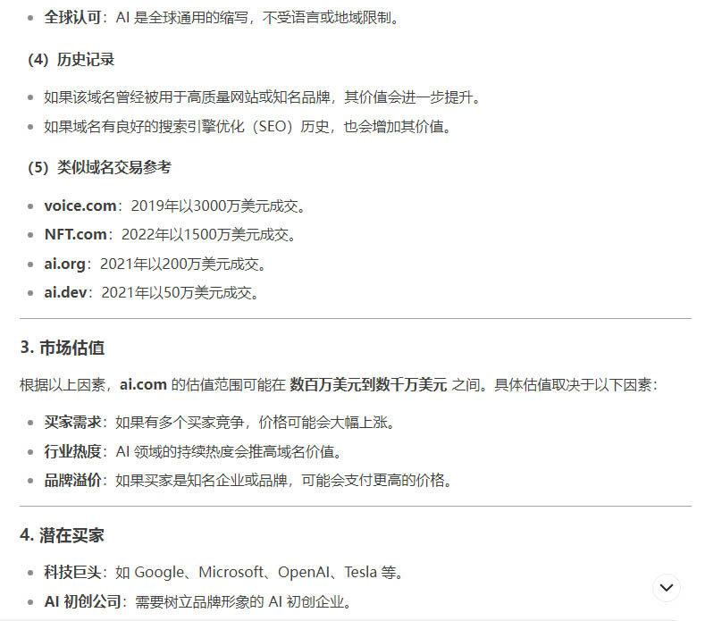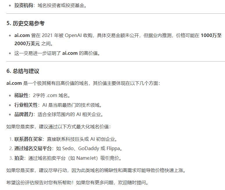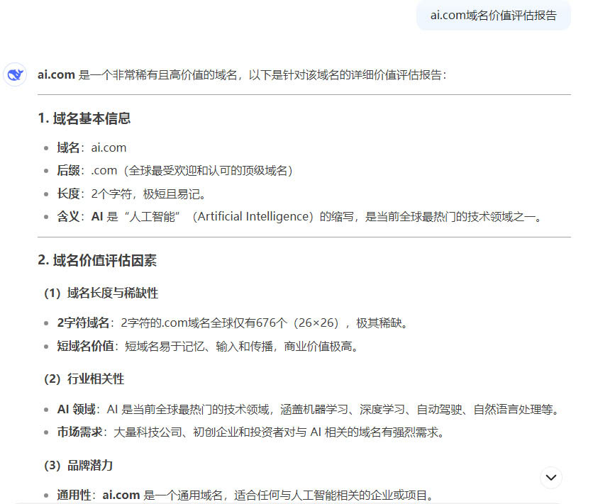 你知道ai.com域名值多少錢呢?Deepseek給出了評估報告!如下: